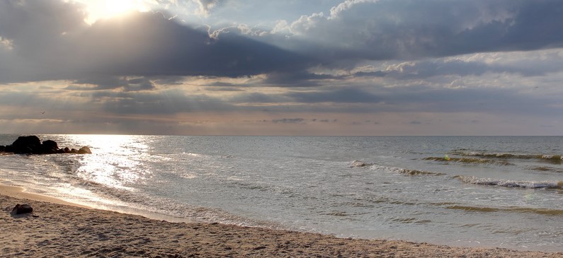 Учитывая, что пляжная полоса здесь не такая большая, как в той же Кирилловке, то особенно ощущается наплыв народа в выходные, пользующихся услугами однодневных поездок. Крупные базы отдыха и пляжные кафе сдают в аренду шезлонги, потому их пляжи чистые, но очень востребованы. Остальная часть побережья также в выходные многолюдна, но, если снова сравнивать с пляжем в центре Кирилловки, то расстояние между шезлонгами и покрывалами вполне ощутимые. Вход в море пологий и плавный с перекатом, близким к берегу. Песка мало, большая часть из мелких ракушек, босиком можно ходить у воды, а вот ближе к полосе баз и кафе нужно быть осторожнее, много стелящейся травы с мелкими и очень острыми колючками, которые в народе называют кирцы. При волнах в море может быстро относить в сторону, если сил и сноровки у Вас не много, лучше возвращаться по суше, чем вернуться в исходную точку по воде.
