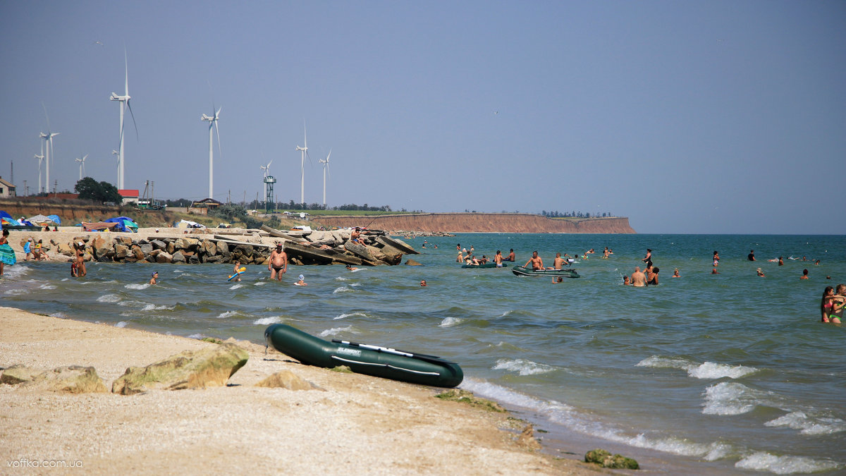 Учитывая, что пляжная полоса здесь не такая большая, как в той же Кирилловке, то особенно ощущается наплыв народа в выходные, пользующихся услугами однодневных поездок. Крупные базы отдыха и пляжные кафе сдают в аренду шезлонги, потому их пляжи чистые, но очень востребованы. Остальная часть побережья также в выходные многолюдна, но, если снова сравнивать с пляжем в центре Кирилловки, то расстояние между шезлонгами и покрывалами вполне ощутимые. Вход в море пологий и плавный с перекатом, близким к берегу. Песка мало, большая часть из мелких ракушек, босиком можно ходить у воды, а вот ближе к полосе баз и кафе нужно быть осторожнее, много стелящейся травы с мелкими и очень острыми колючками, которые в народе называют кирцы. При волнах в море может быстро относить в сторону, если сил и сноровки у Вас не много, лучше возвращаться по суше, чем вернуться в исходную точку по воде.